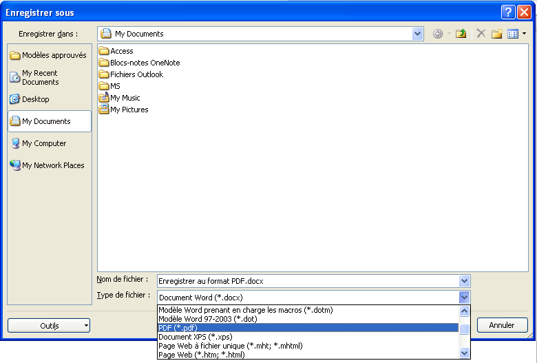 Pour Word 2010, Pour convertir des documents Word en document PDF, il suffit d'utiliser la commande "Enregistrer Sous" et de choisir le format PDF dans la liste déroulante. ![]() Enregistrer Sous ![]() Choisir PDF dans la liste | ||